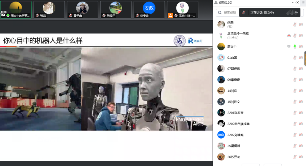 活动主讲嘉宾技术总监周文中,就本次活动主题从以下三个方面展开。首先通过设置问题:你心目中的机器人是什么样,引入本次演讲主题《人形机器人Baxter》;然后就人形机器人灵巧与简便易用等特征,通过拖拽示教、人机跟随等应用展示,与同学们探讨了机器人的设计结构、使用方式、数据模型、运动规划和控制等问题进行详细讲解;最后,周文中总监在国家、公司大力发展人工智能学科教育的趋势下,年青一代如何在“元宇宙”的发展浪潮中找准自己的学习目标和职业定位进行了启迪性的发言。