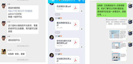 有效挖掘校外优质资源,与科大奥锐和润尼尔虚拟仿真平台公司合作,依托虚拟平台,开展仿真实验,做到“停课不停学”、“实践不延期”。教师们尽快熟悉虚拟平台,积极与代课教师沟通,确定实验具体的内容及所需环境。大家分工合作,确保疫情期间实践教学和开放教学正常开展。