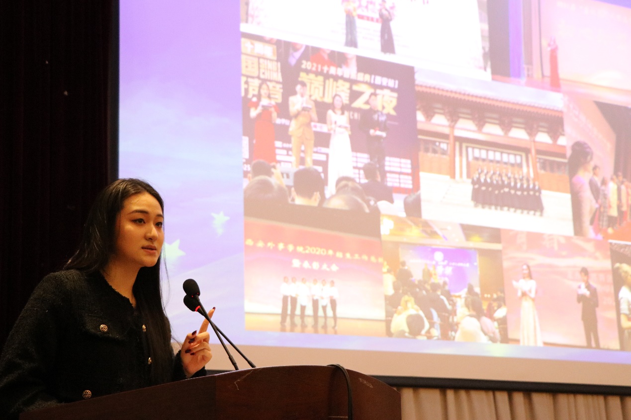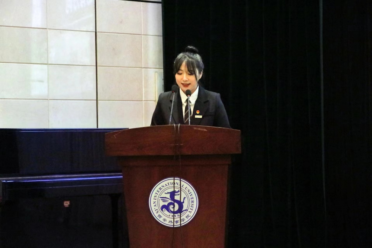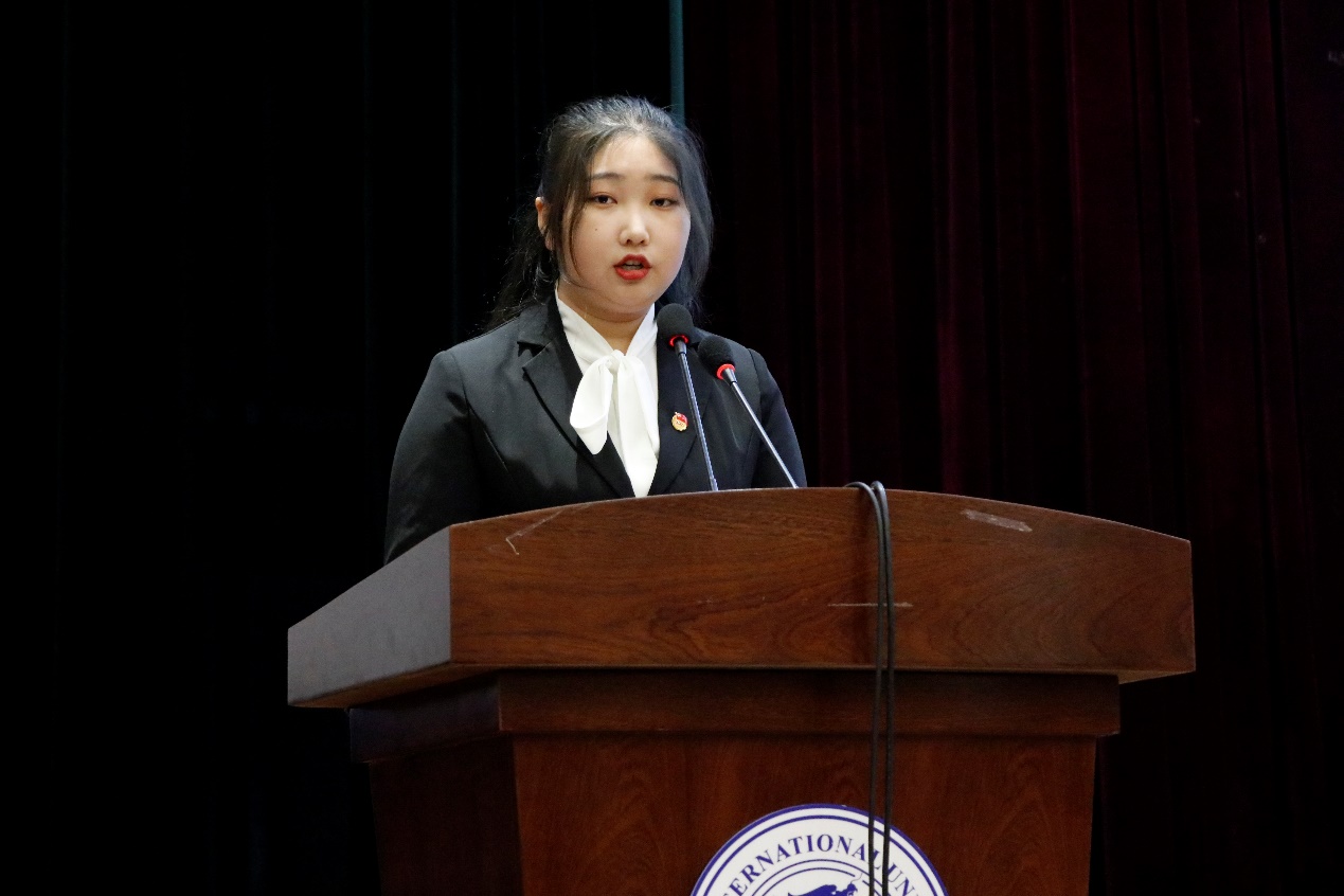 她来自国际合作公司英语2001班。她以“心中有目标,行动有方向”为主题结合自己实践经历与公益事业,向同学们展现了自己作为外事学子优秀素养,充分发扬了外事学子的青春与活力,如一面旗帜飘扬在外事天空。