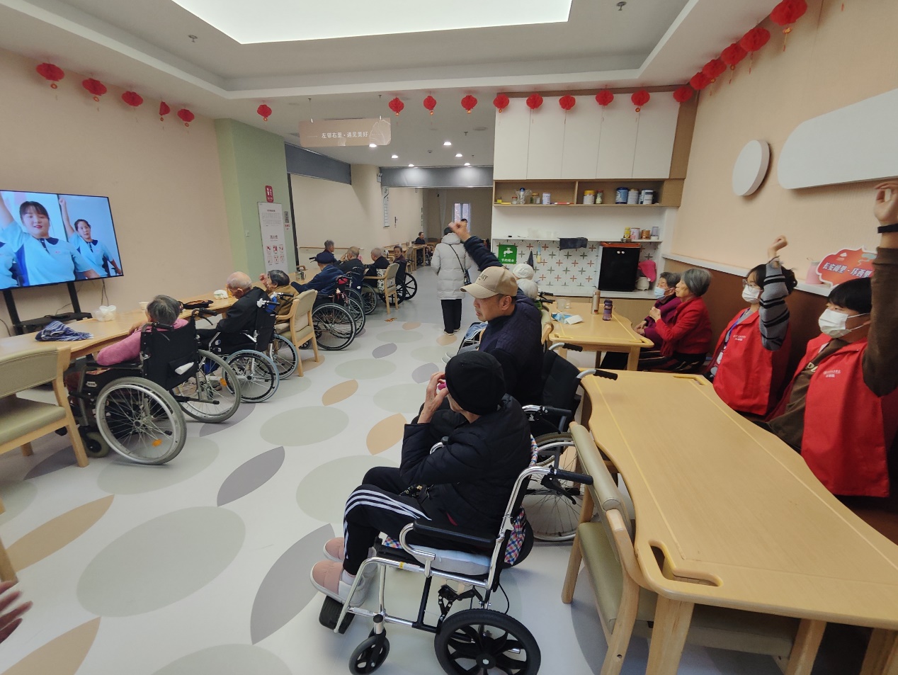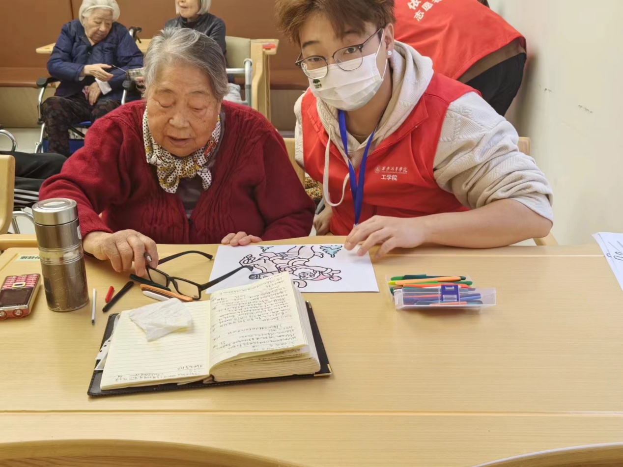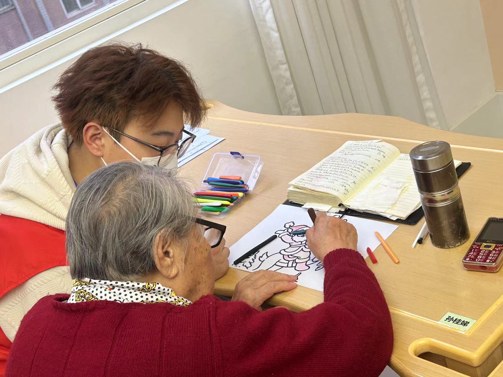 除了送上爱心围巾以为,志愿者们还同老人们一起做轮椅操以及手指操,与老人们一起画画,一起做计算,聊天交流,询问他们的身体状况和日常生活情况,表达了对老人们的关心和敬意。