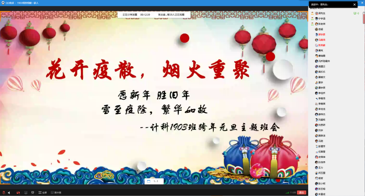 为了提高同学们对疫情防控的认识,加强抗疫决心,能够以积极乐观饱满的心态迎接2022年。“愿新年 胜旧年”,12月30日,计科1903班线上举行“花开疫散,烟火重聚”雪至疫除,繁华如故跨年元旦主题班会。本次活动由班长梁一尘主持,计科1903班全体同学参加。