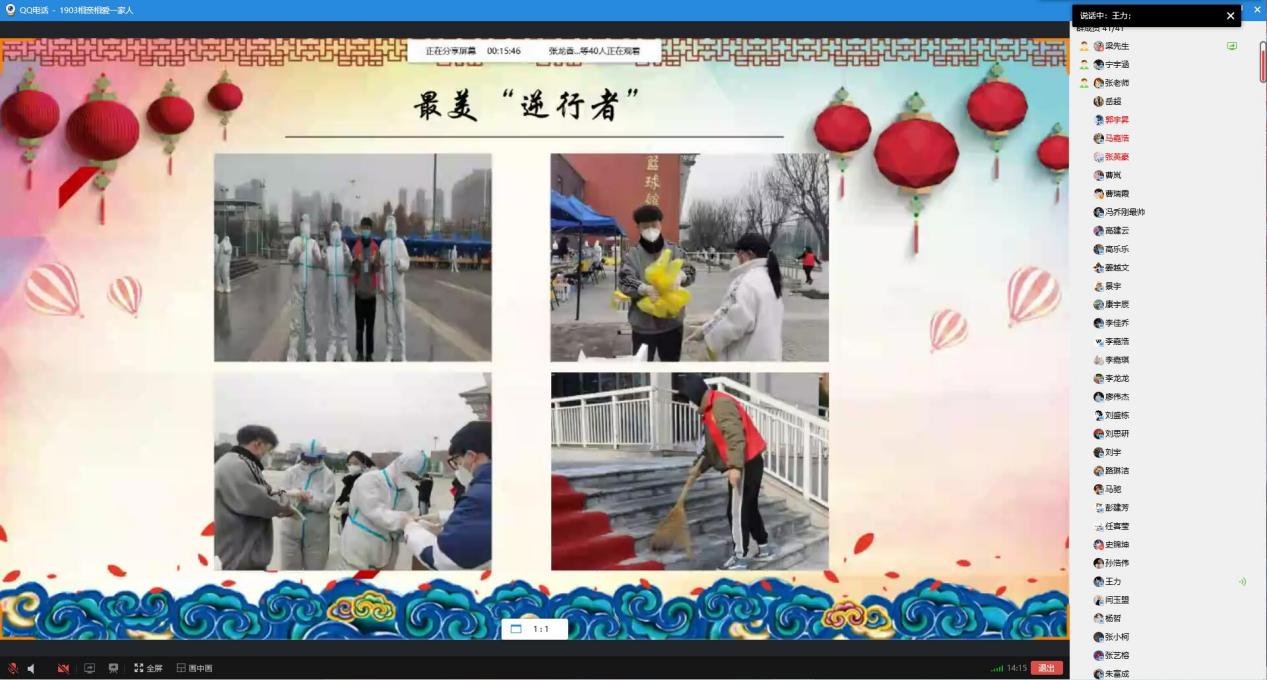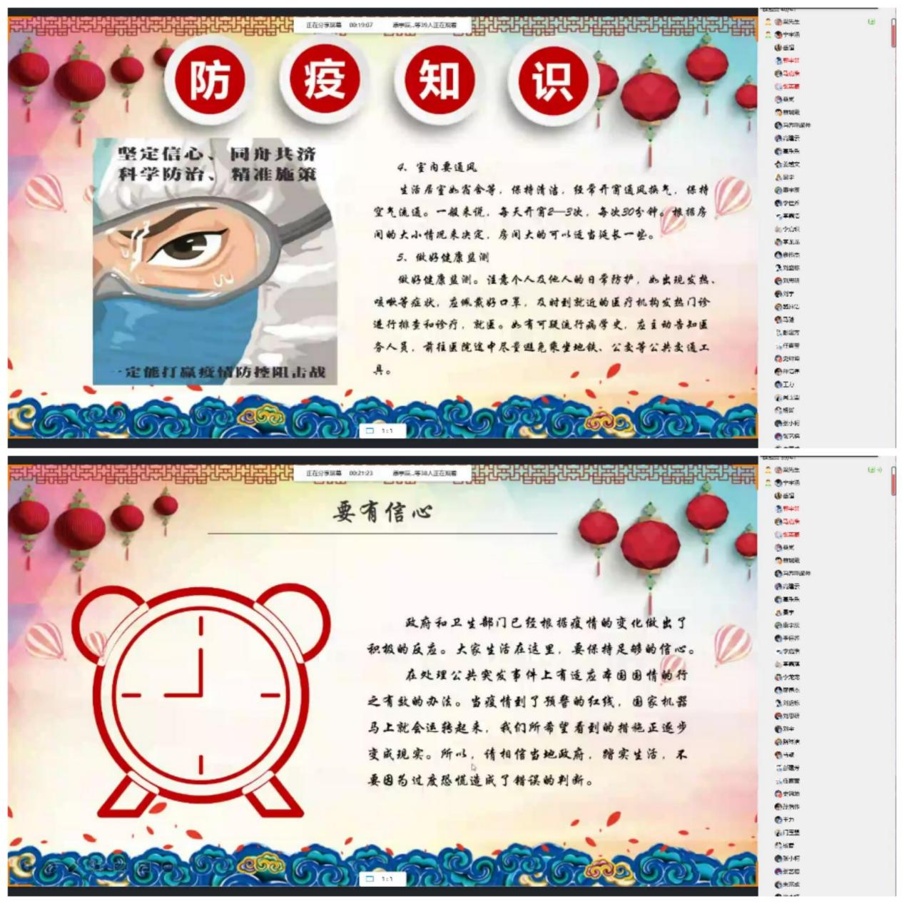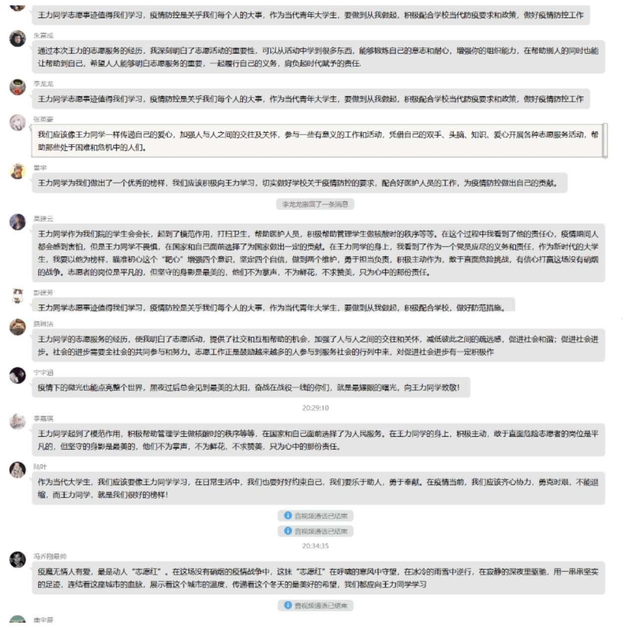 最后,辅导员张老师鼓励大家:“来自五湖四海的我们,见证过疫情的残酷,但有些同学还对疫情停留在初级阶段,认识不足,动力不足,但这一刻我们必须众志成城、携手抗疫。在疫情期间,大家要做些力所能及的事情,相互帮助,展现老员工的风采,为抗疫胜利做出自己的贡献,相信有党和政府的领导和我们共同努力,一定会取得抗疫胜利。