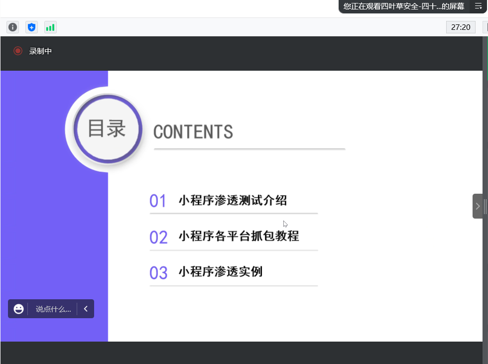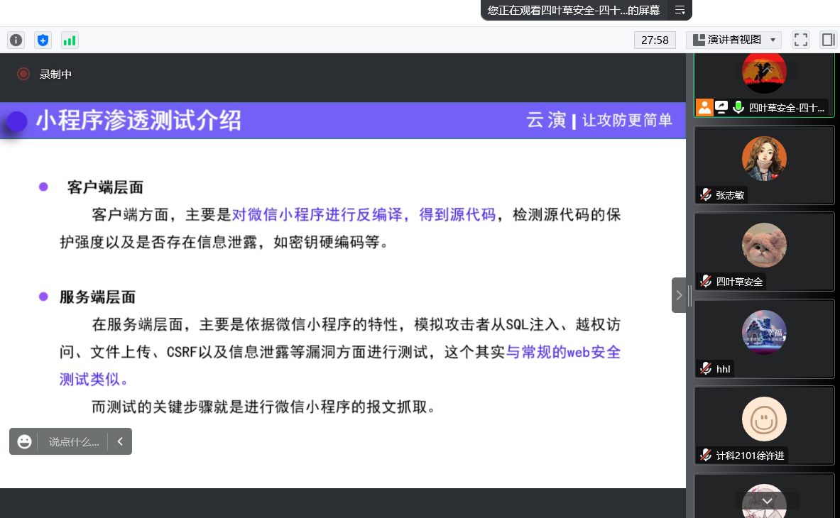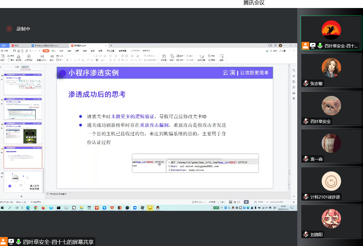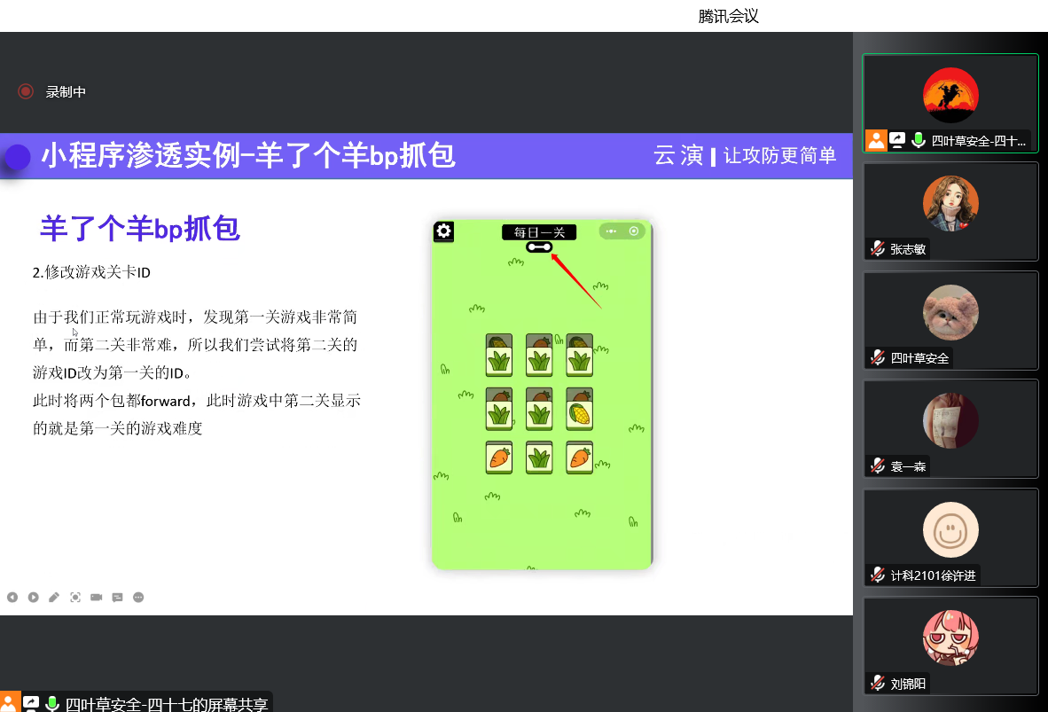 此次分享会的主题是渗透知识技能、网络安全意识、行业市场方向、行业就业问题分析、网络安全学习成长方向规划。首先,由四叶草公司人才培养创研中心高级攻防演练工程师(ID:四十七)讲解网络常见的渗透、抓包技术,并结合当下火爆全网的游戏“羊了个羊”进行渗透实例的演示及讲解。