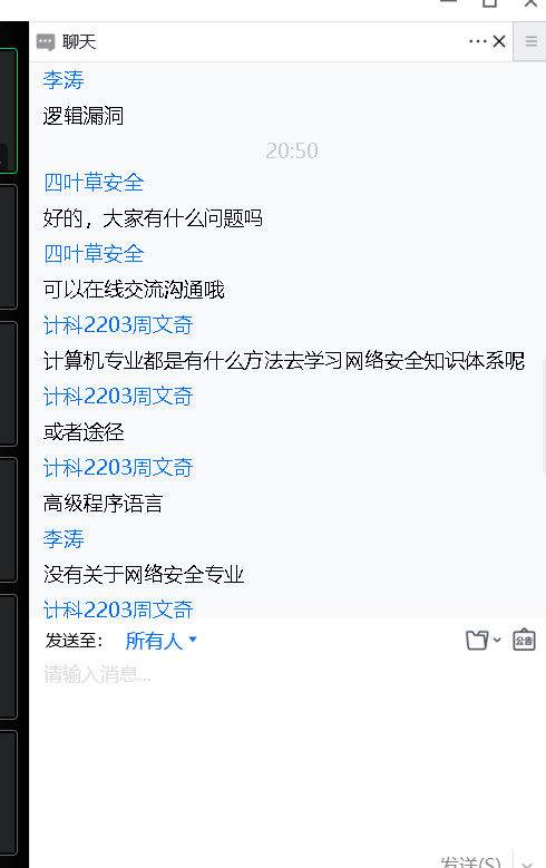 最后是互动环节,22级大一的萌新们针对刚进校网络安全知识还是空白,该如何学习,学习中比如网络渗透等有哪些专用软件等问题跟企业导师进行了交流,大二大三的团员针对老师讲解的技术问题,提出自己的思考。整个交流活动气氛热烈,原定一个半小时的会议最后持续了两个多小时。