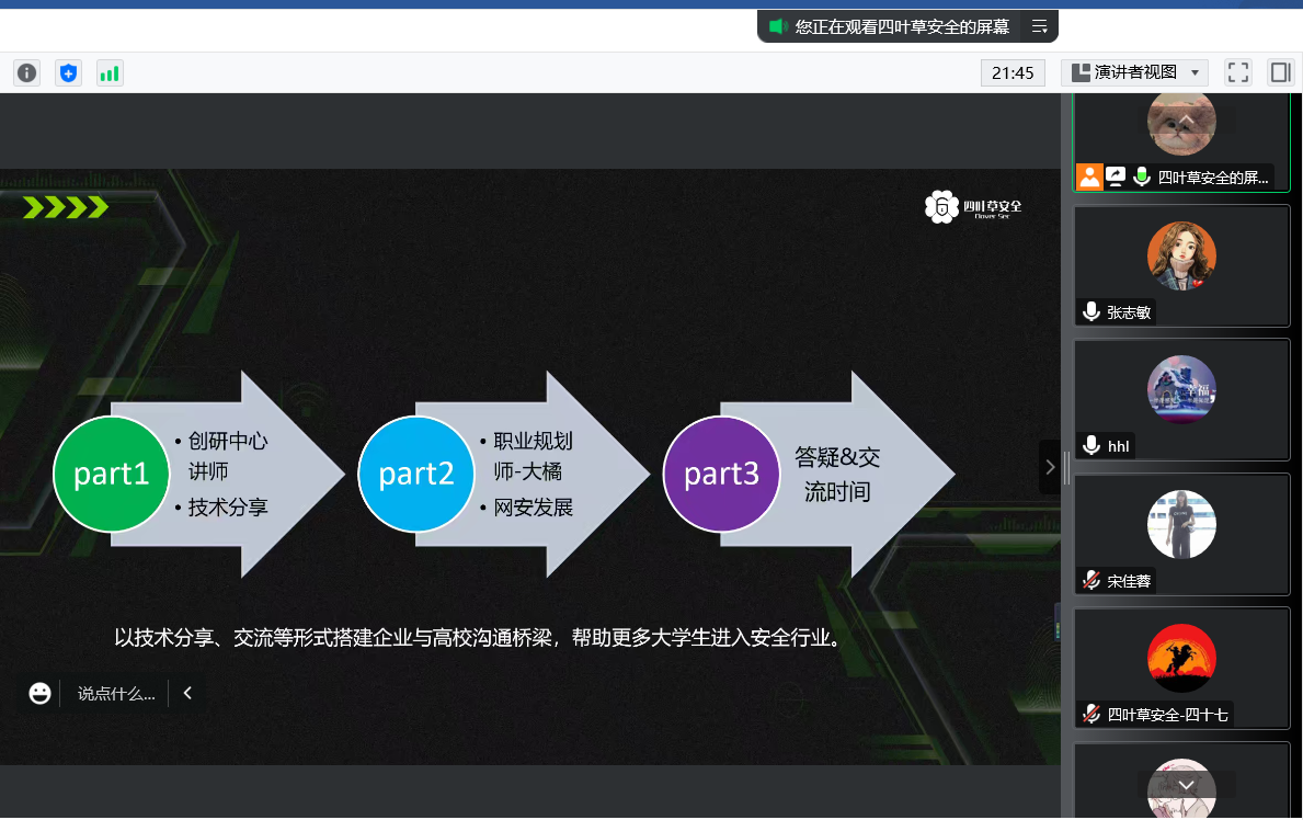 随后,由四叶草公司人才培养与创新研究中心教育事业部职业规划师大橘为同学们剖析了网络安全行业发展现在及趋势,以及网络安全的不同岗位对专业能力的要求。
