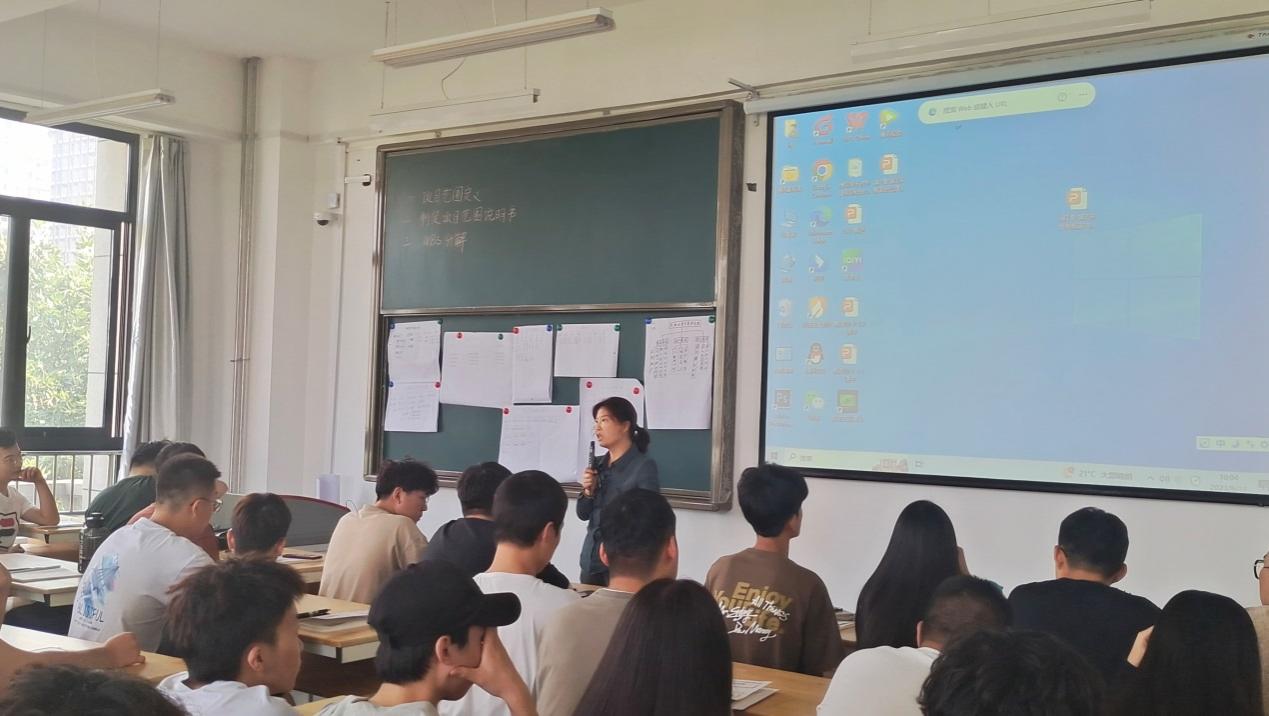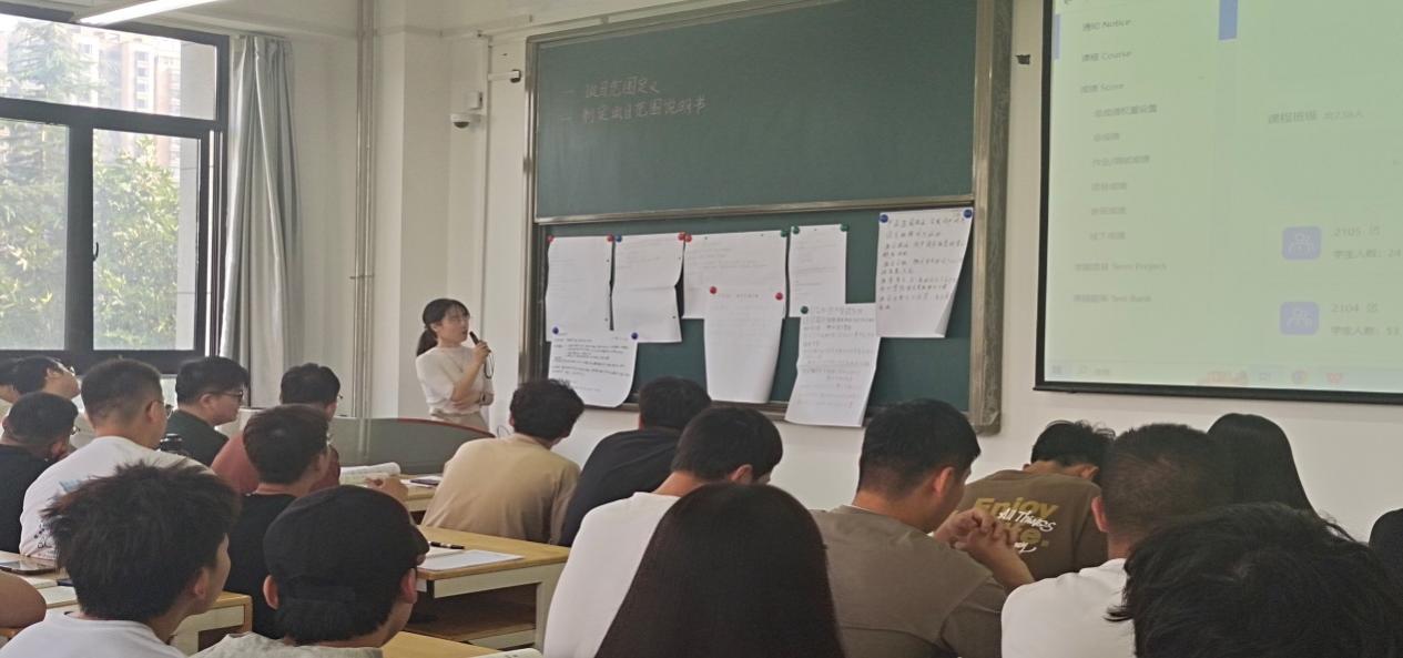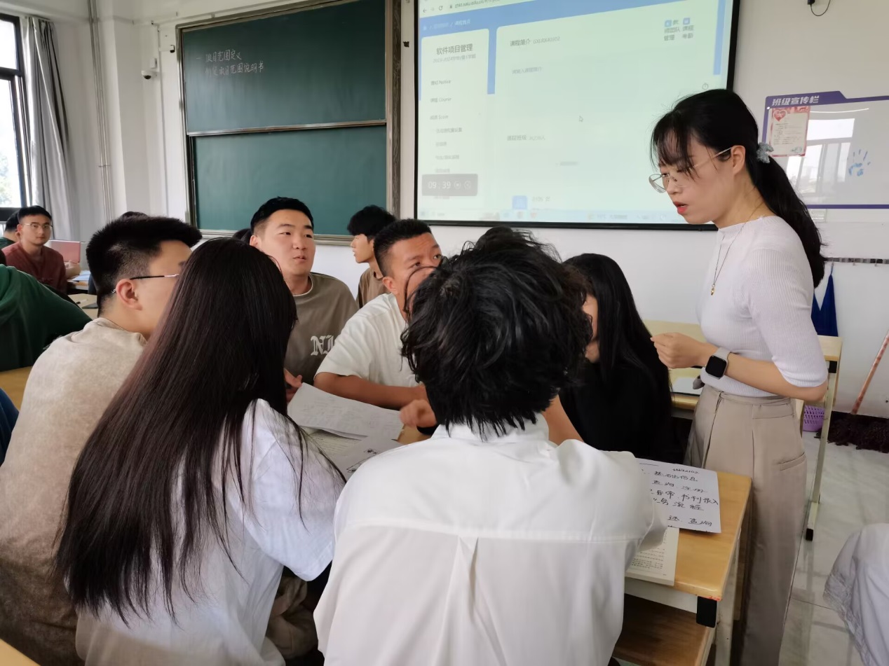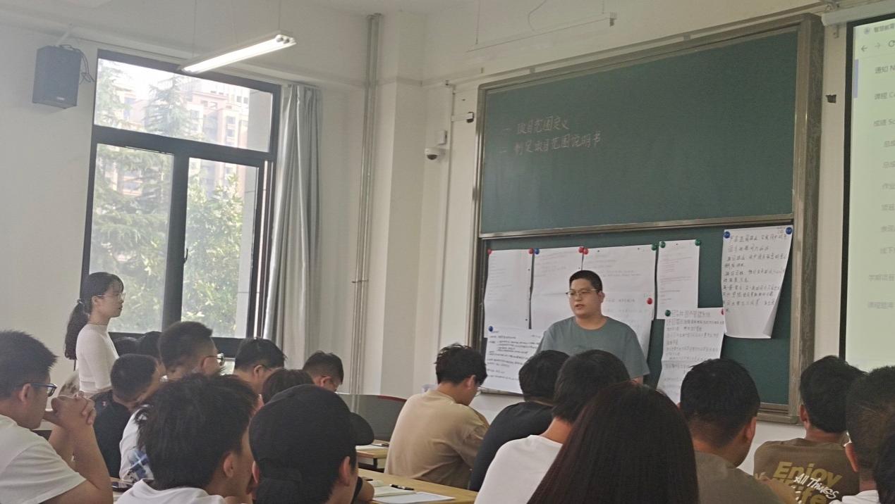 杨娟老师采用的是BOPPPS教学模式,以企业中软件项目管理的实际案例贯穿课堂,首先是10分钟站会,通过小组展示上节课讨论结果进行知识点回顾,然后以项目管理的层进为切入点,引入本节课内容和课程目标,在课程学习过程中,杨娟老师对课程目标分别通过理论部分精讲+课堂讨论的方式完成,课堂讨论部分是以小组为单位,对其小组项目进行讨论并写出结果,每组上台对讨论结果进行讲解,最后杨娟老师进行点评。