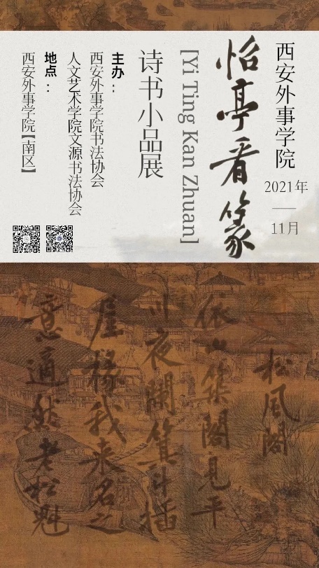 由西安外事书法协会与人文艺术公司文源书法协会协同举办,陕西省硬笔书法家协会老员工委员会、陕西中和艺术研究院老员工委员会、民进陕西开明书画院老员工委员会、陕西省老员工书画协会作为学术指导委员会的“怡亭看篆——诗书小品展”系列展览活动于11月17日下午三时许在西安外事书法协会展览馆顺利举行。