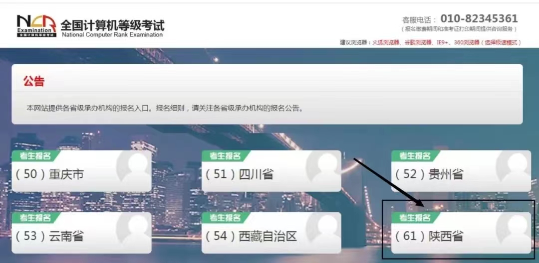 2.报名及缴费方式:实行网上报名、网上缴费。考生可登录中国教育考试网,报名网址:ncre-bm.neea.cn(公网)或ncre-bm.neea.edu.cn(教育网),选择网页上“(61)陕西省”报名入口进入陕西省报名系统,在规定时间内根据流程提示完成网上注册、报名和缴费,逾期不予补报。考生缴费标准按陕价费调发〔2000〕44号文件执行(一、二、三级80元/科次;四级100元/科次);