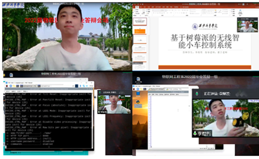 其中,李煜哲同学的“基于树莓派的无线智能小车控制系统”更是吸引了评审组老师的眼球。李煜哲同学首先阐述了论文选题的背景和意义,在讲述到自己设计的关键部分时,为了更好地展现小车的控制实现效果,利用电脑摄像头边分享屏幕敲代码,边演示小车实现控制的效果,丝毫没有受线上答辩的限制。整个答辩过程时长足足40分钟,条理清晰,系统功能演示思维敏捷,熟练度高,很好地展现了物联网工程专业员工的专业功底,获得了在线领导、督导和老师的高度评价。