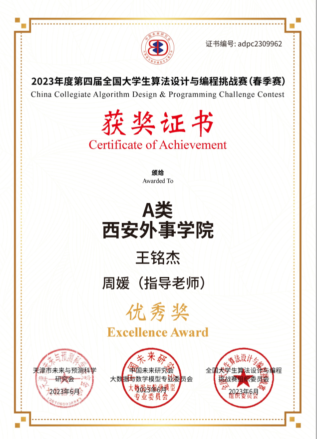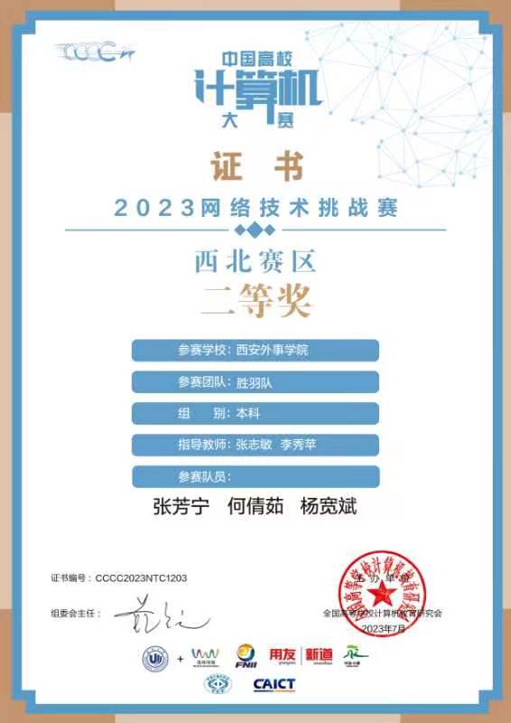 6月,计算机系师生参加了中国计算机大赛2023网络技术挑战赛,荣获西北赛区二等奖1项。