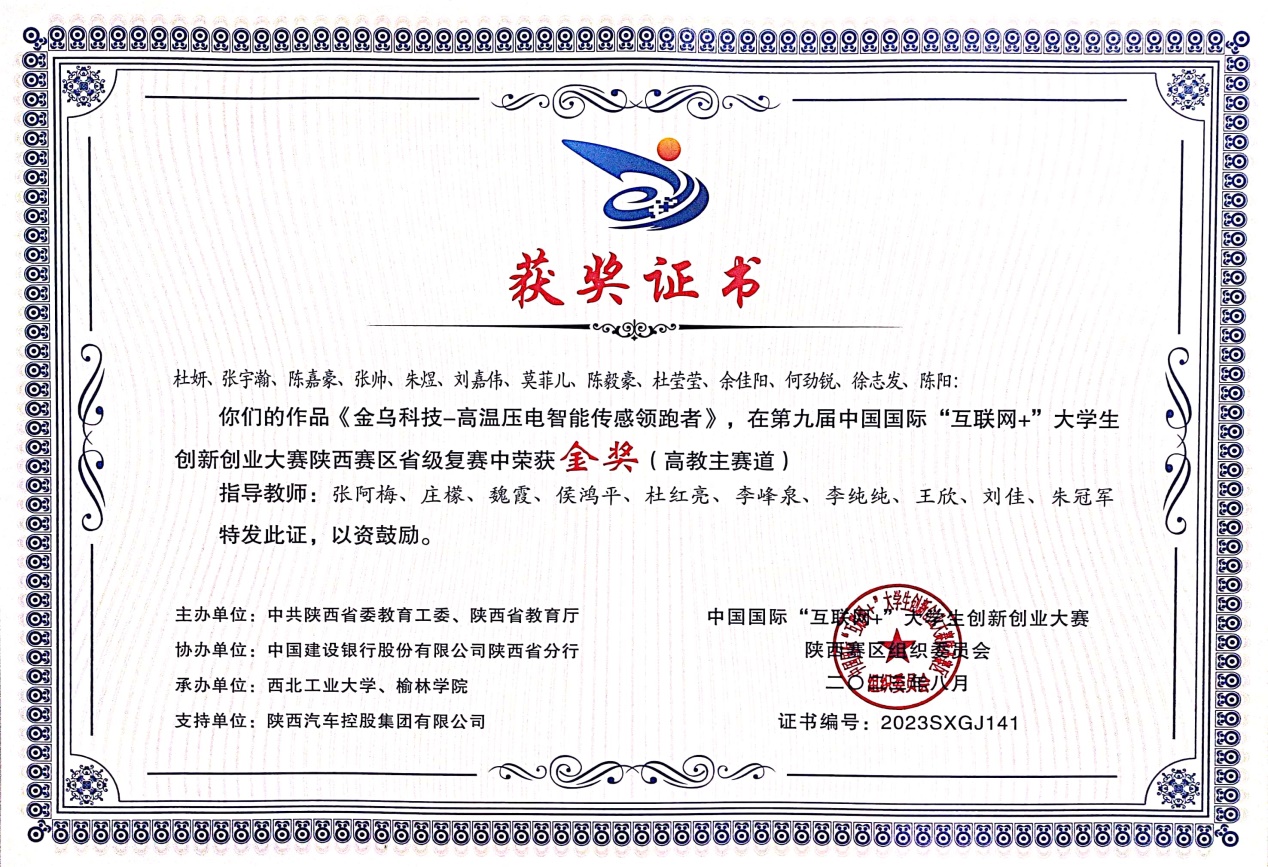 8月,第九届中国国际“互联网+”老员工创新创业大赛公布了结果,公司《金乌科技-高温压电智能传感器领跑者》项目荣获高教主赛道省级金奖1项,另荣获银奖1项、铜奖6项。