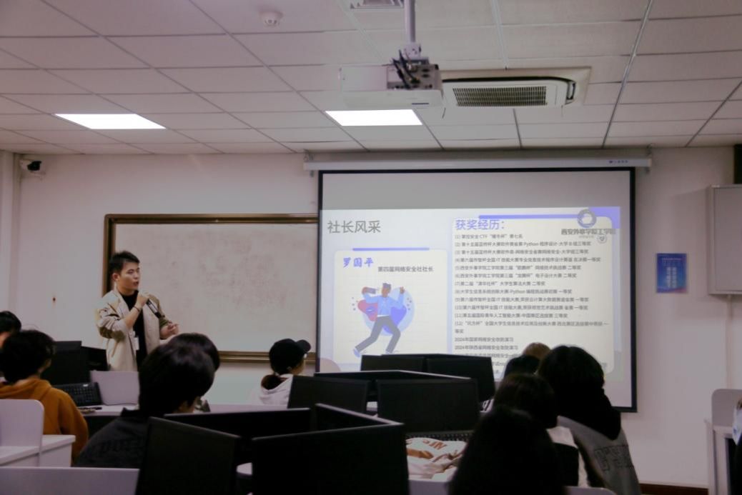 接着,由新一届社长张煜发言,他主要介绍了对社团未来一年的工作计划,将继续带领全体社员参加网络安全攻防演练、漏洞挖掘与修复等各类实践活动,不断提升社团在网络安全领域的实战能力。