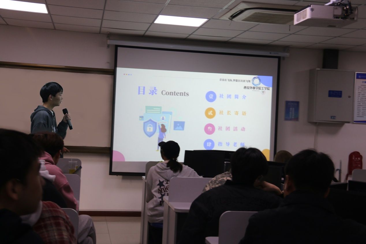 其次,社长罗国平上台发言。他先总结了自己任期一年的社团工作,接着分享了自己在社团学习经验,通过社团利用暑期参与到网络安全公司的实际项目的实习经历,鼓励新社员在学好本专业课程基础上,充分利用课余时间学习自己感兴趣的网络安全知识,积极参与社团组织的活动。