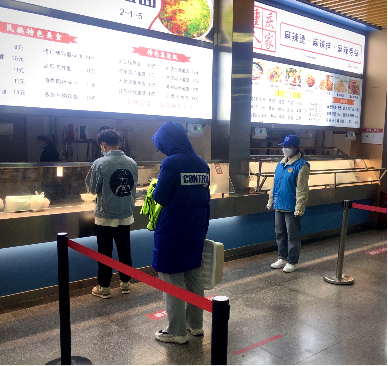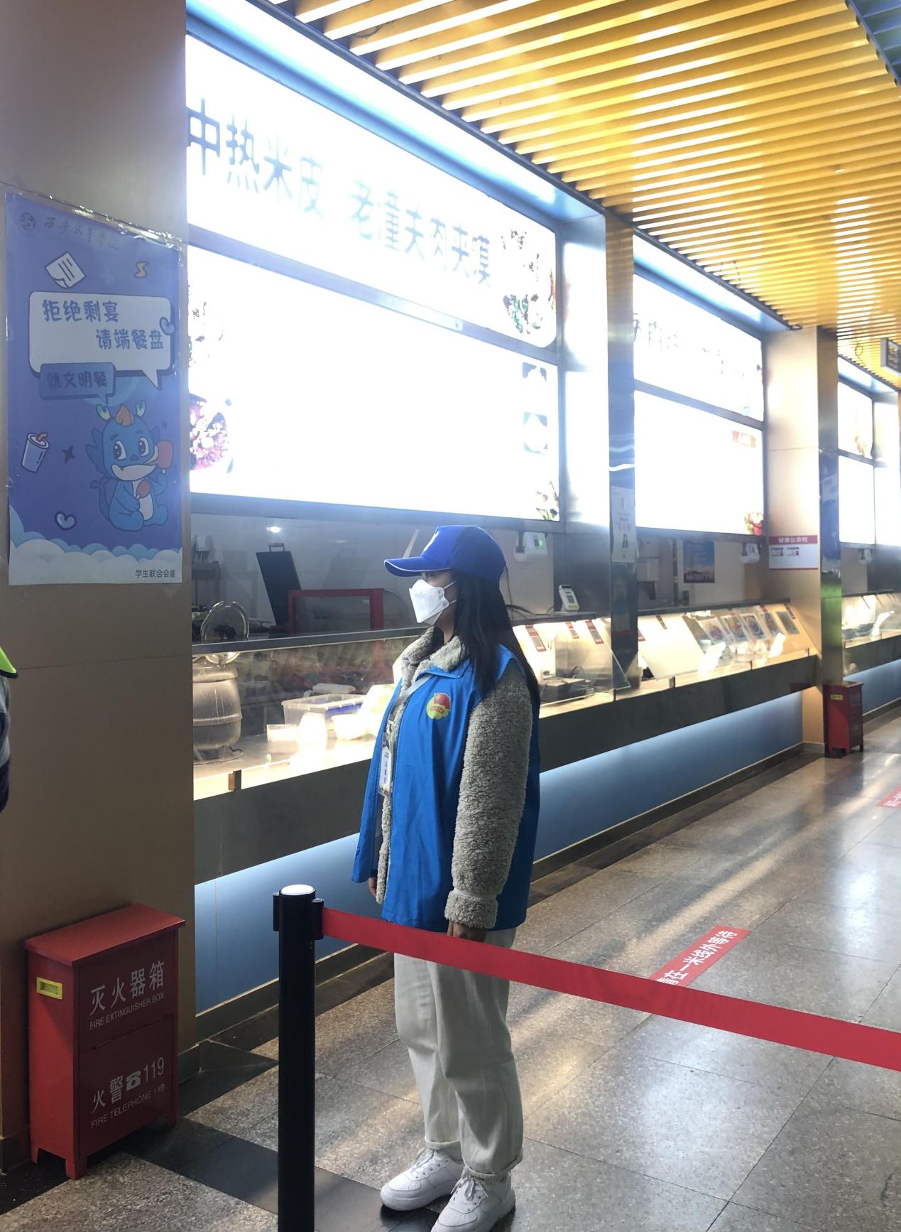 她的志愿活动内容是帮助餐厅人员搬运食材、为食堂窗口的尖尖配送提前排好顺序,为送餐节省了时间,维持好自提同学的现场秩序。