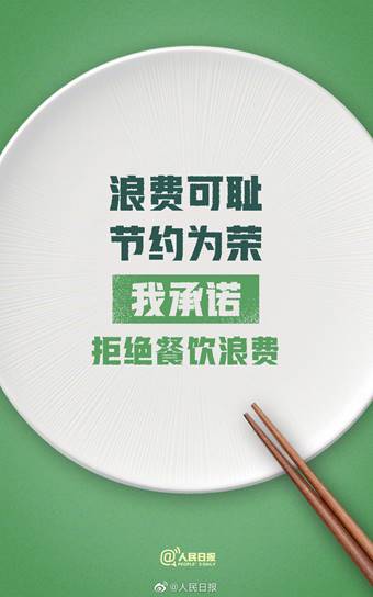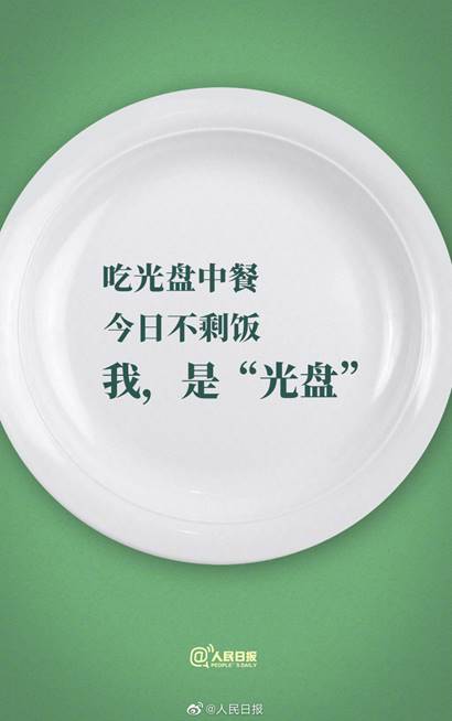 以传承为美,弘扬新风尚。从自身做起,从现在做起,从每一餐做起,把“光盘行动”当做一种习惯,当做一种修养和责任,以“光盘”为荣,以“剩菜”为耻,做到吃光盘中餐、餐餐不剩饭、剩菜要打包,杜绝“舌尖上的浪费”。