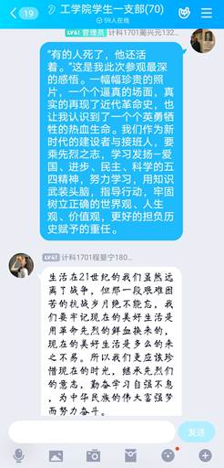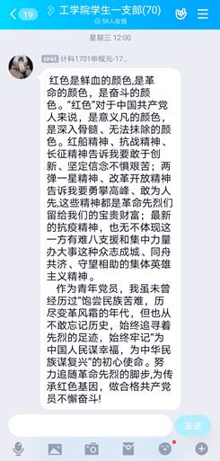 随后,大家纷纷在支部群里分享学习感言,相互交流学习,将从革命历史中汲取智慧和力量,牢记宗旨,爱岗敬业,敢于担当。进一步加强思想自觉和行动自觉,充分发挥党员的先锋模范作用,立足本职岗位,增强科研创新意识,为党的事业努力奋斗,为实现伟大中国梦贡献力量。